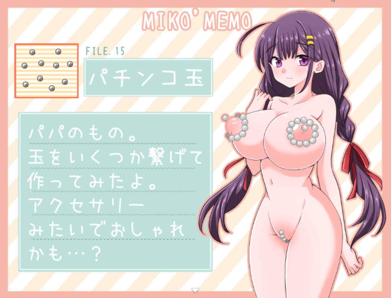(あと射精時に勢い良く服が吹き飛ぶ? 差分が三々五々多く、けっきょく乳首諸々見えるんかいというのと、バリエーション的な楽しみと……)