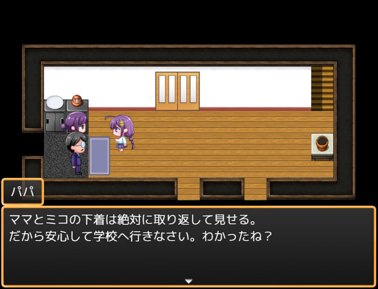 ・ある日主人公のミコとパパ・ママの一家が目を覚ますと、全ての下着が盗まれていた!!(なぜ??)