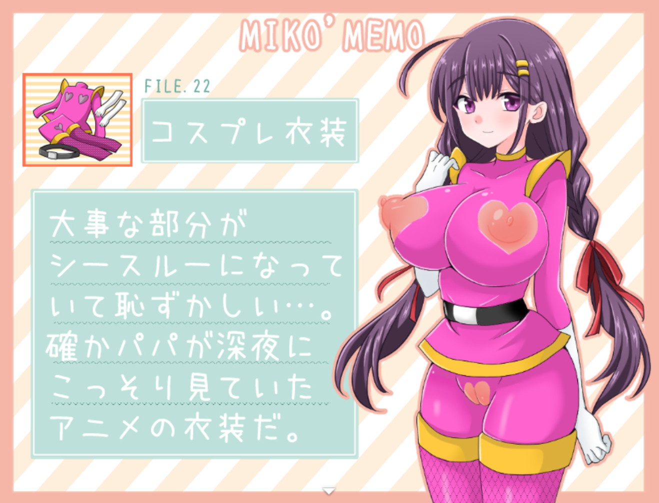 あとまぁそれに輪を掛けるのが、設定上、例えば体操服とか水着とか、いかにもコス感ある特別なエロが待ってそうな物ほど、普通に体育教師の目を潜り抜けられてしまう……逆にエロが起きるのは、だいたい乳首とあそこをギリギリ隠してる系の衣装であって、ちょっと存在が被りがちってのもあるし。(♡シールは卑猥だけど、これだけで三種類ある)