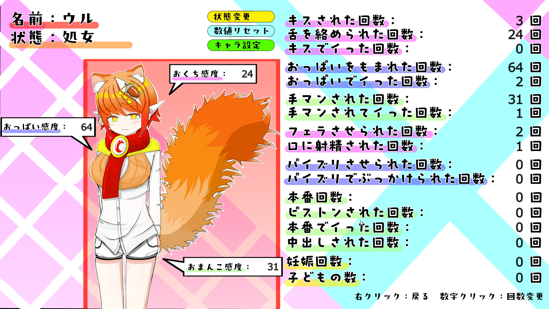 ただここでもケモ的な概念性が光るのは、Hステータスに「妊娠回数」「こどもの数」などがある事で……。