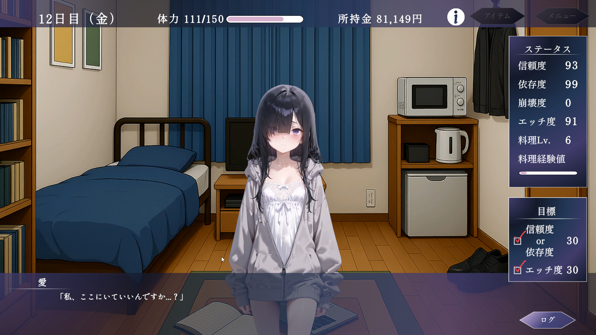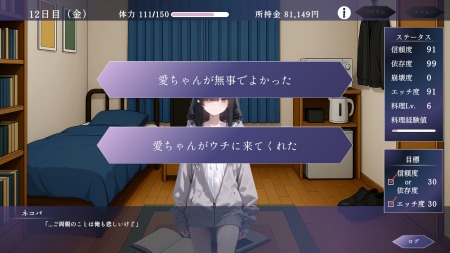 同棲SLGというより、一定ターンごとにパラメーターの足切りがある育成SLGぽい感じかな。(体験版だと一週間ごとに「信頼・依存度」と「エッチ度」のチェックがあり、それ以下だとゲムオバ)