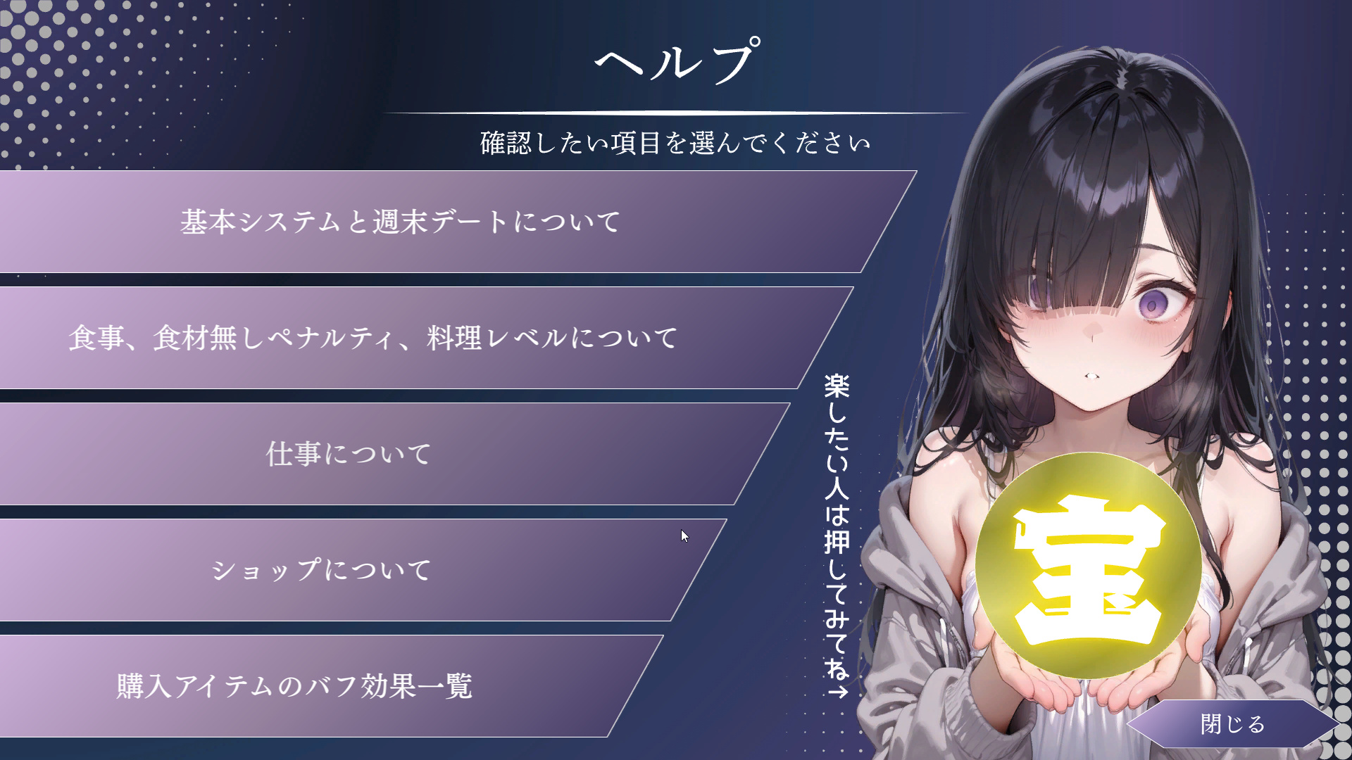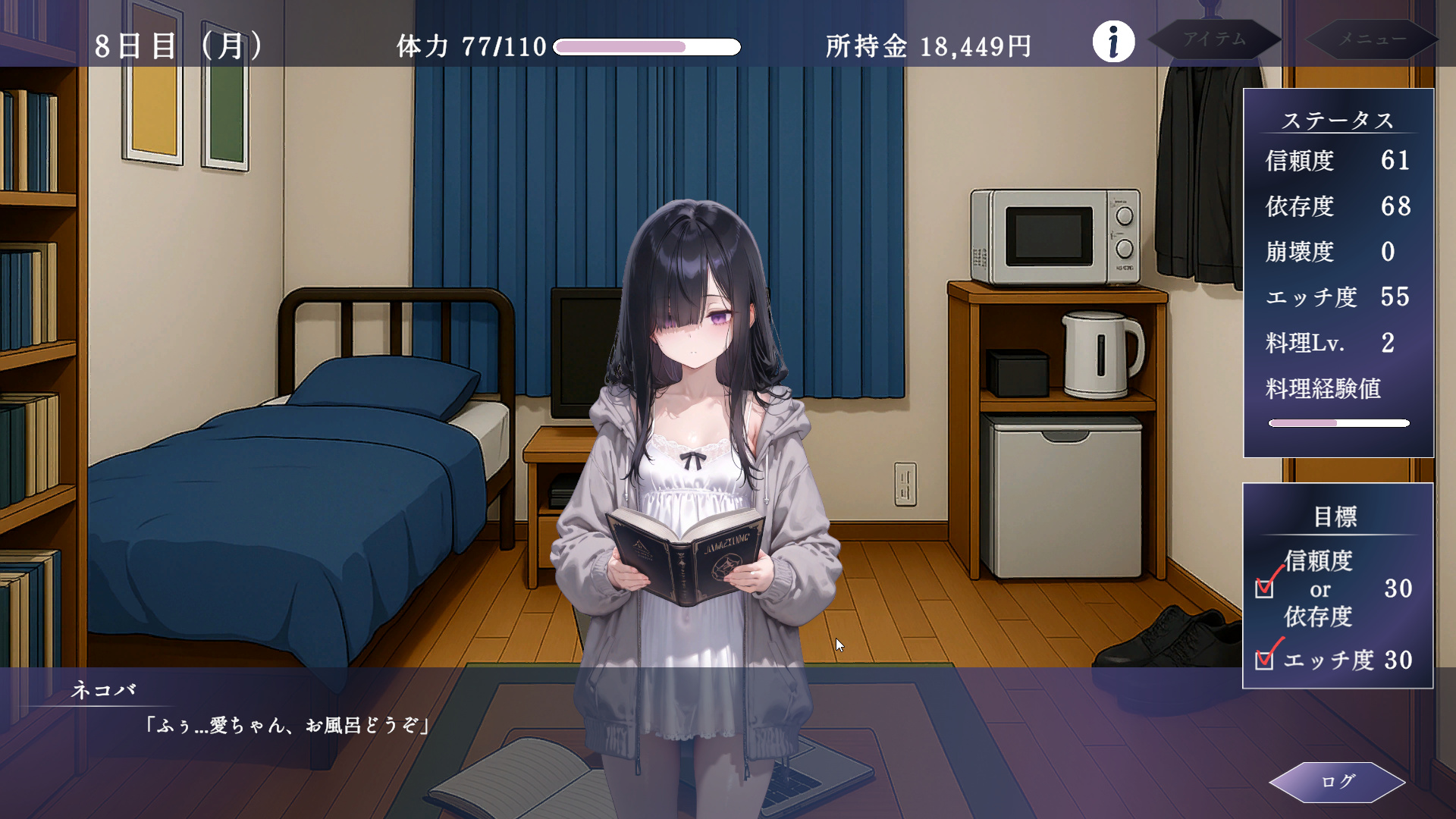 分かればすぐ飲み込める運びではありますが、反面、パラメーターへの影響が割と直接的であり、かなりルーティンぽくなっちゃうかな、という感じは。(一応、曜日限定アイテムとかで散らそうとしてるのも分かりますが……)