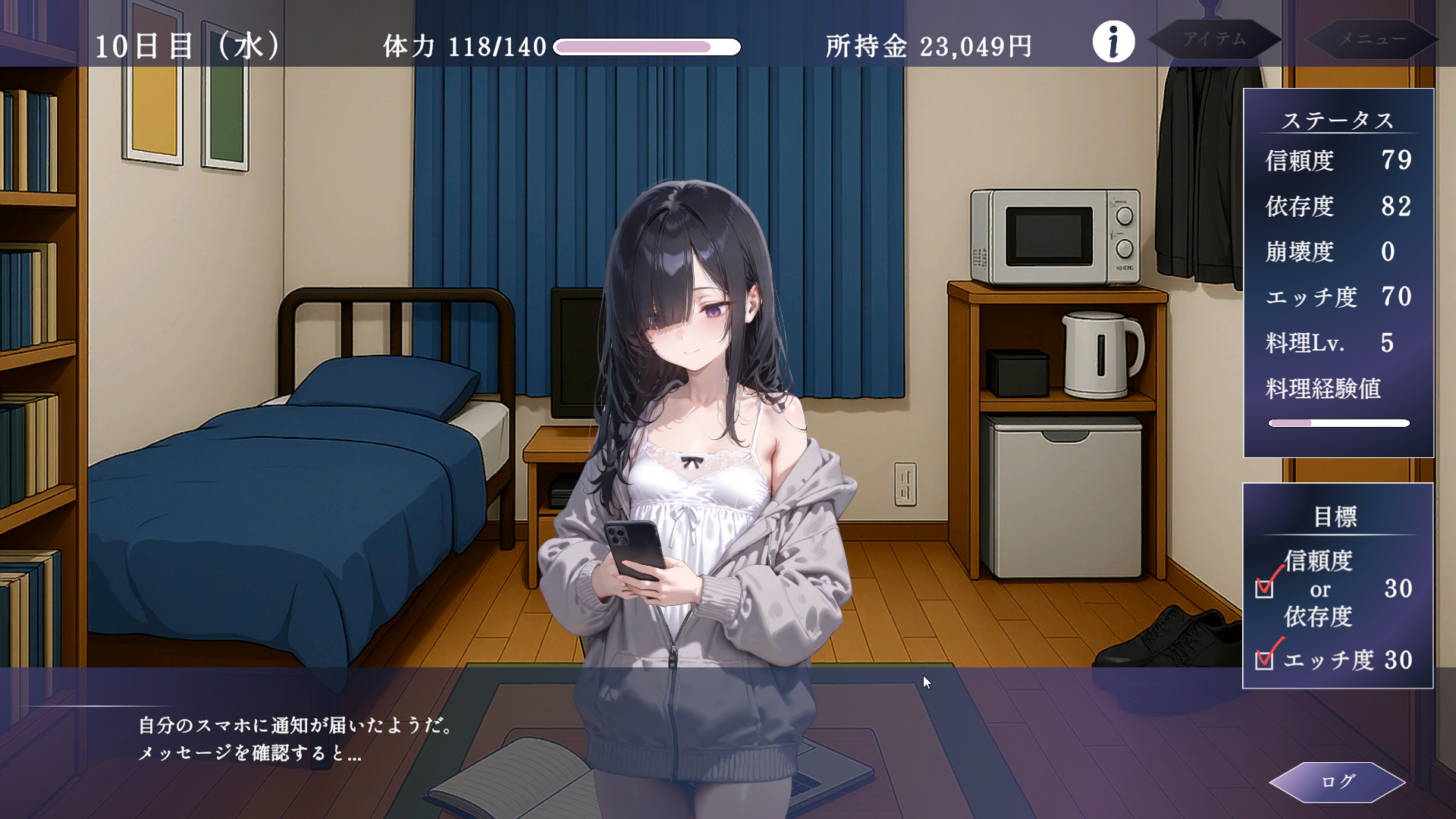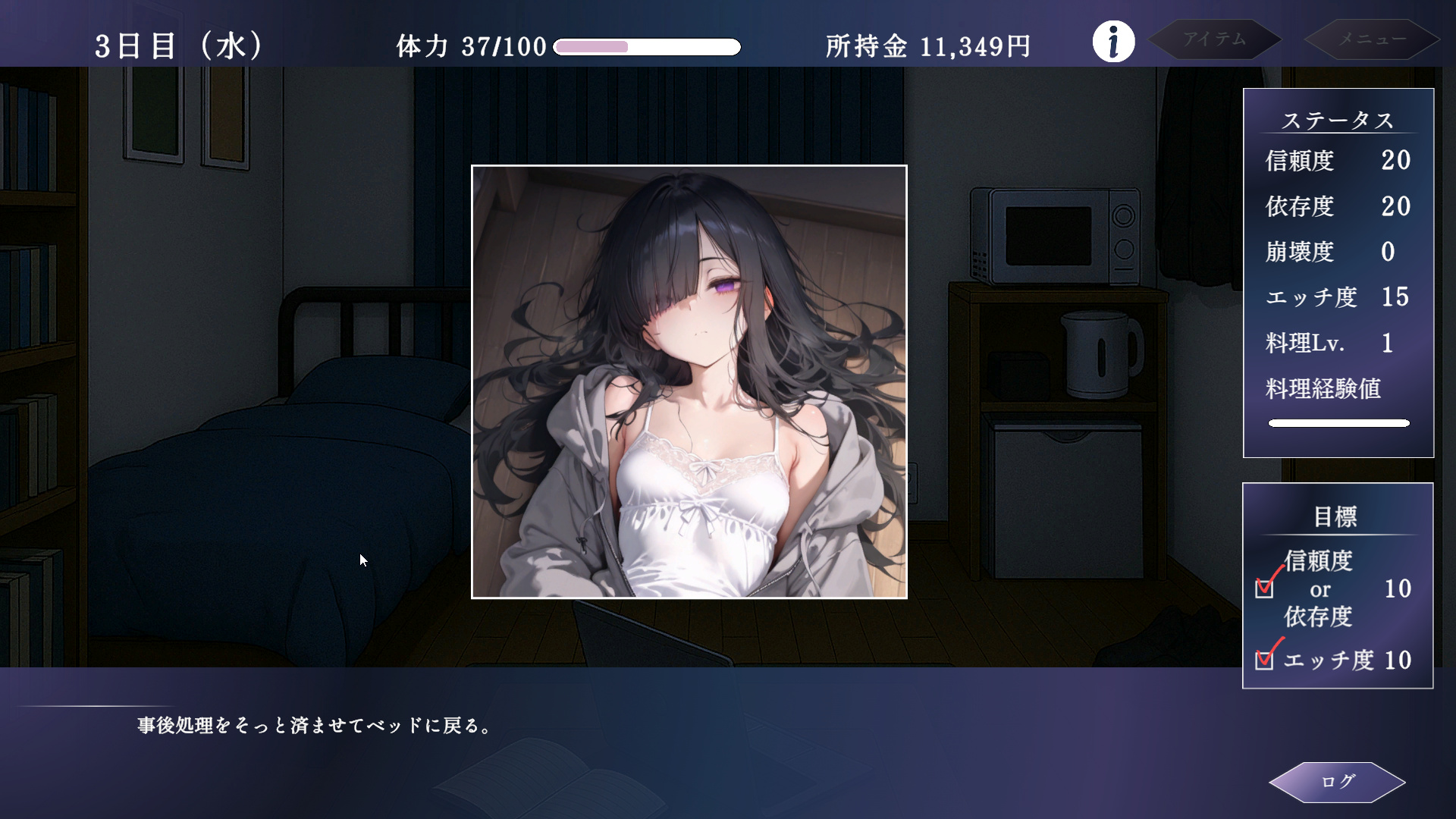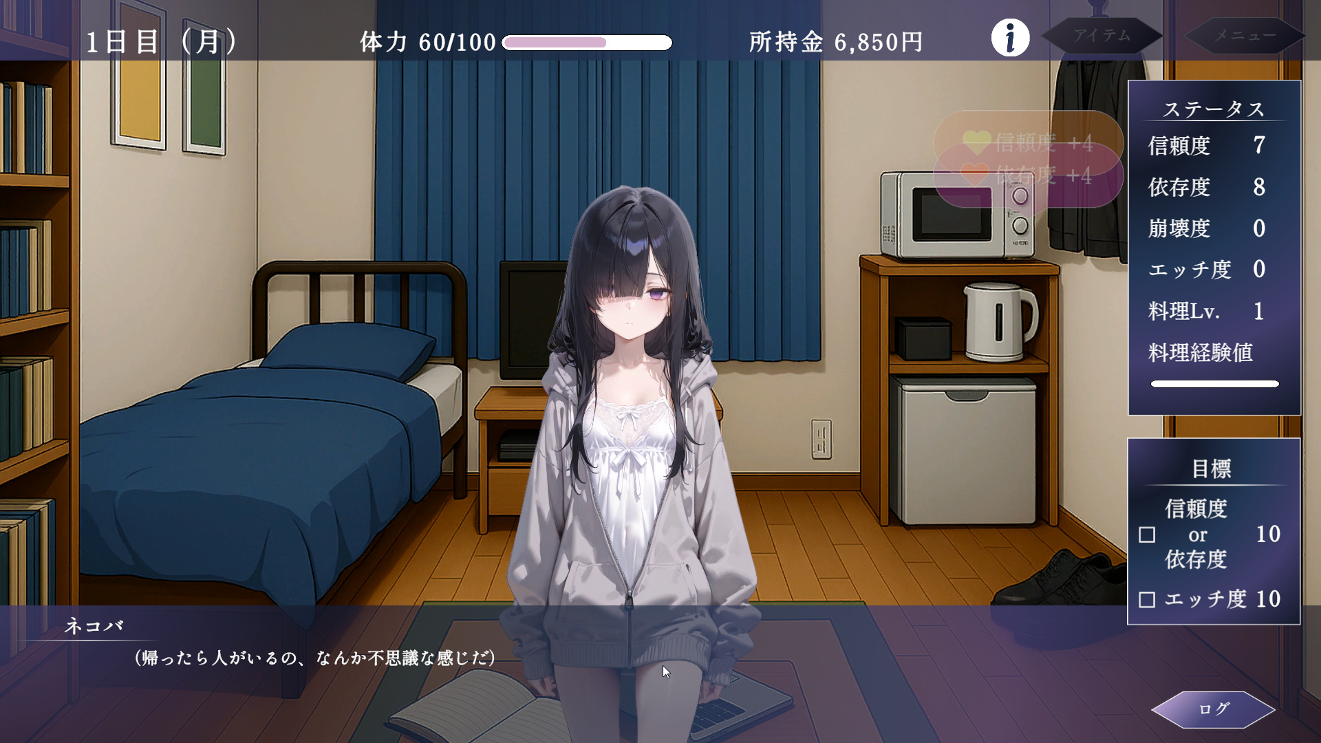 (ただ、この狭いワンルームにベッド二つあったら大変だろ……と思ってたら、やっぱアイテム購入しても部屋のレイアウトの変化とかは無くて残念。「狭くなったけど、これで安心して寝られるね」みたいな事を分けあうのが、むしろ同棲SLGの文脈では?