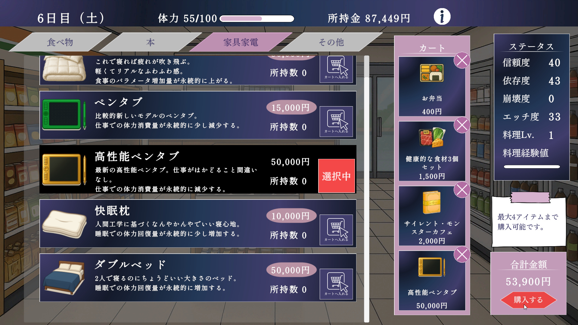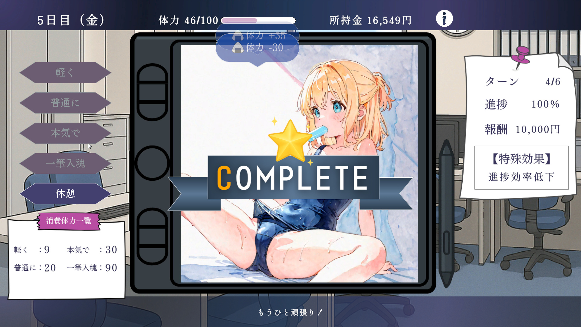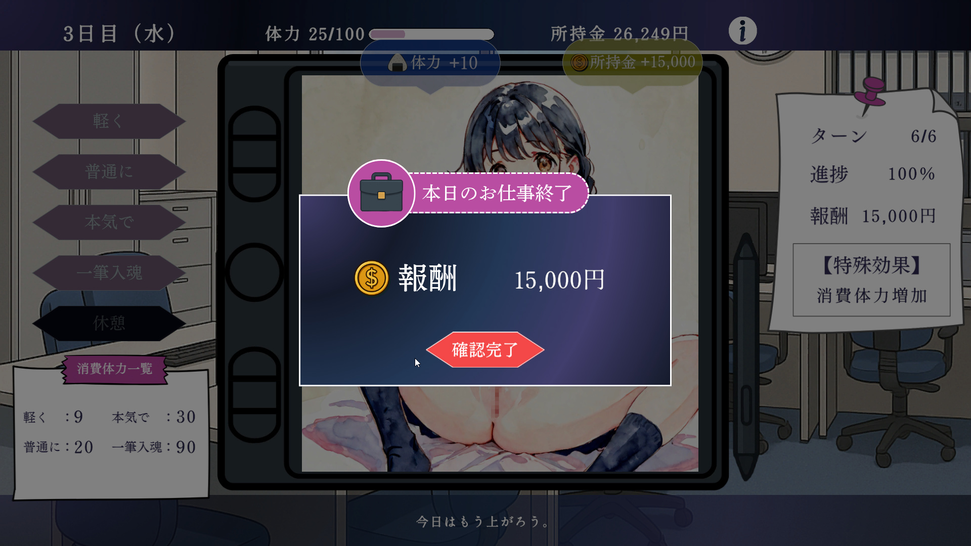 基本の流れとしては毎日、仕事(エロ絵描き)を行い、仕事をこなせば即金でお金が入るので、何を買うかで大きくパラメーターに影響。