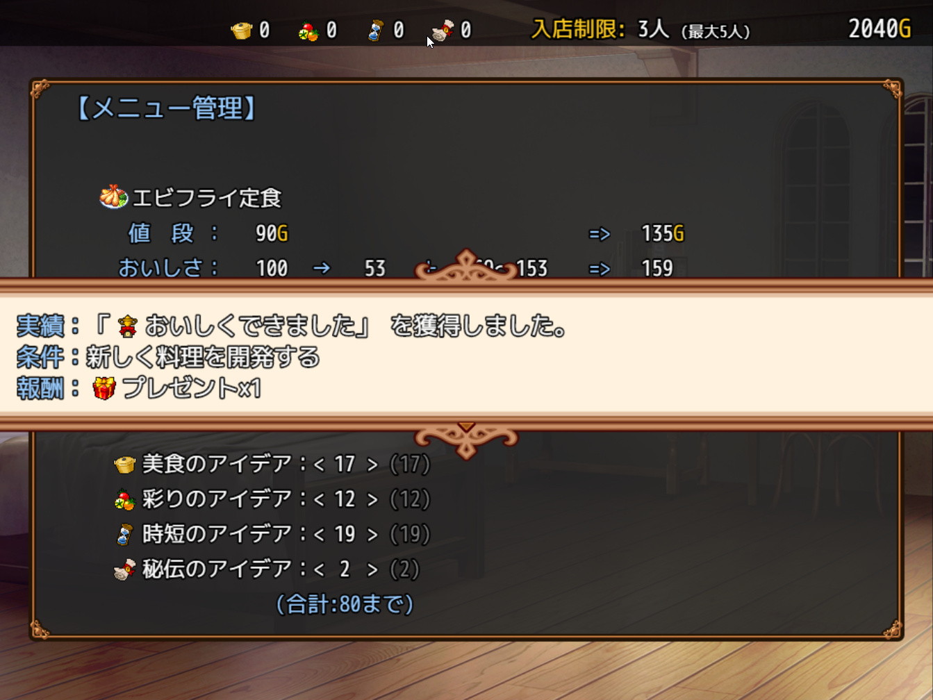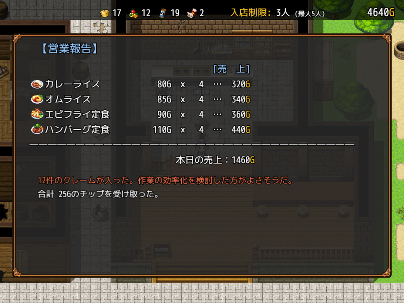 すると見る間に手際が向上した従業員は体感もう俺が手伝わないで良いほど、次から次へと皿を片付けてくれるし、試しに料理に補助を付けてみたら、方向キー入力なんか1,2回で終わるし。まぁ料理に関してはね、俺がすごい改善したからこうなるよね……(自分のした事のフィードバックを噛み締める)