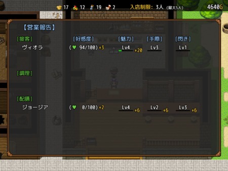 で受け付けに初期メンバーの一人、あとは店長(俺)のツーオペだった体制から、SLG的にせめて配膳くらいは用意しなきゃねと「雇用」すると、見下ろしのゲーム画面の方にもちゃんと出来た料理を自動で運んでくれる歩行キャラが登場する。見た目の変化があるわけ。