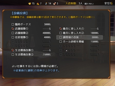 例えば店舗の施設を拡張したいけど、お金が無いから初期はあれが無いこれが無いといった状態で凌ぎ、まずは小さい改善からという事で新しい従業員を雇ったり。