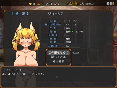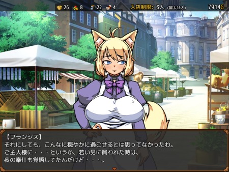 しかも今作は飲食店経営SLG……という事で、同ジャンルだと、例えば酒場に冒険に調教にと忙しかった[夢見る酒場と秘密の調教](つまりUnity製)なんかが思い出されるんですが、今作はツクール製、しかも[夢見る酒場…]よりは小規模な感じなんですよね。