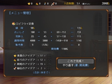 毎日店をやってば自然と溜まる「閃き」をここぞとばかりに最大投下(投入数で改善度が変わるけど、まぁMAXでやるよねっていうか、この「全部いったれ!」感を出す為の前振りに過ぎない、この場合の数字決定は)