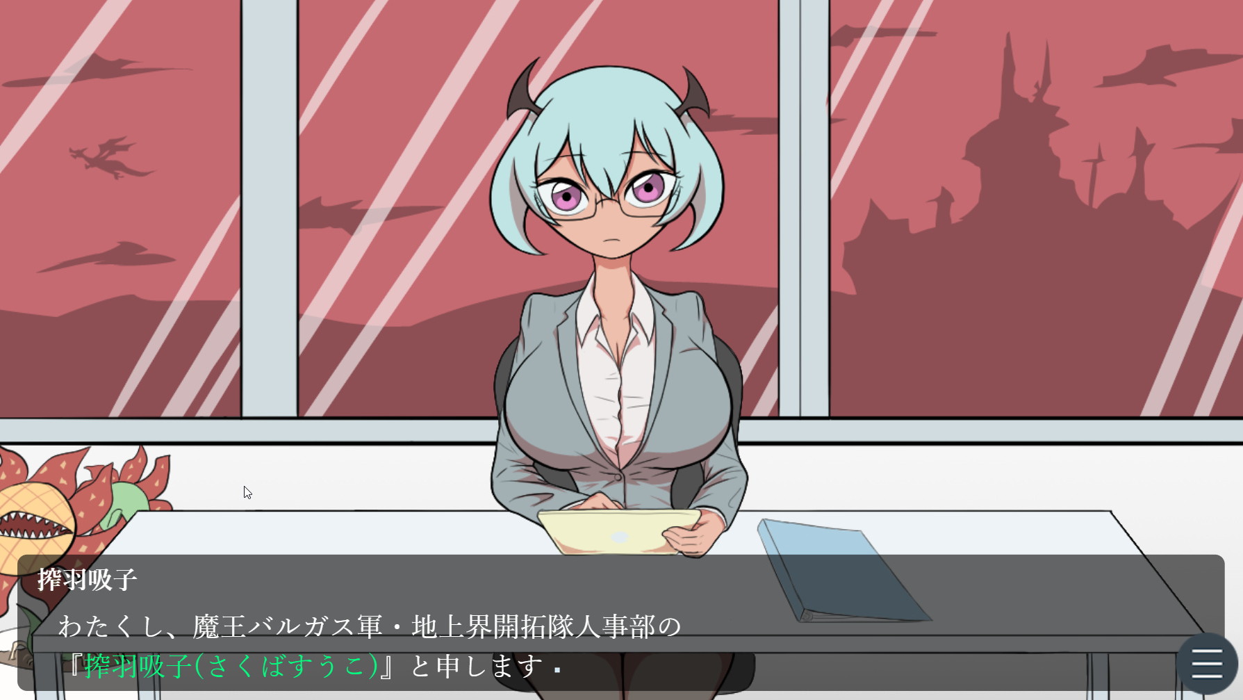 相まってビルの窓から遠くに見える魔王城が時代錯誤的の存在感を放っていたり、近くに植えてあるパックンフラワー的なのは観葉植物の代わりかと思ってたけど、もしかしたら面接失敗時の”処分用”なのか……!?(そもそも面接官がサキュバスだし)といった、なんとも現代の習慣とファンタジーが入り交じった、変わり種シチュな妙味も楽しめるのかな、と思えます。