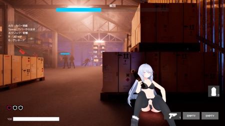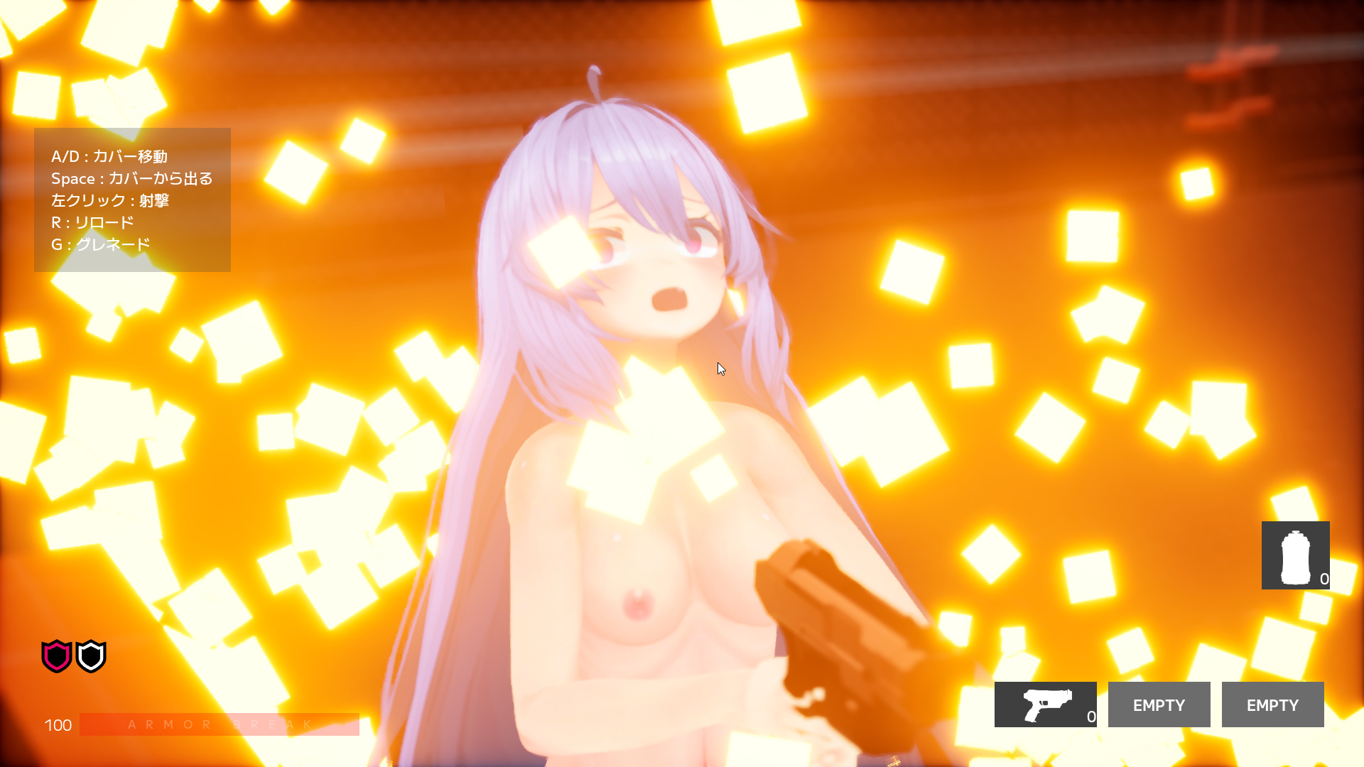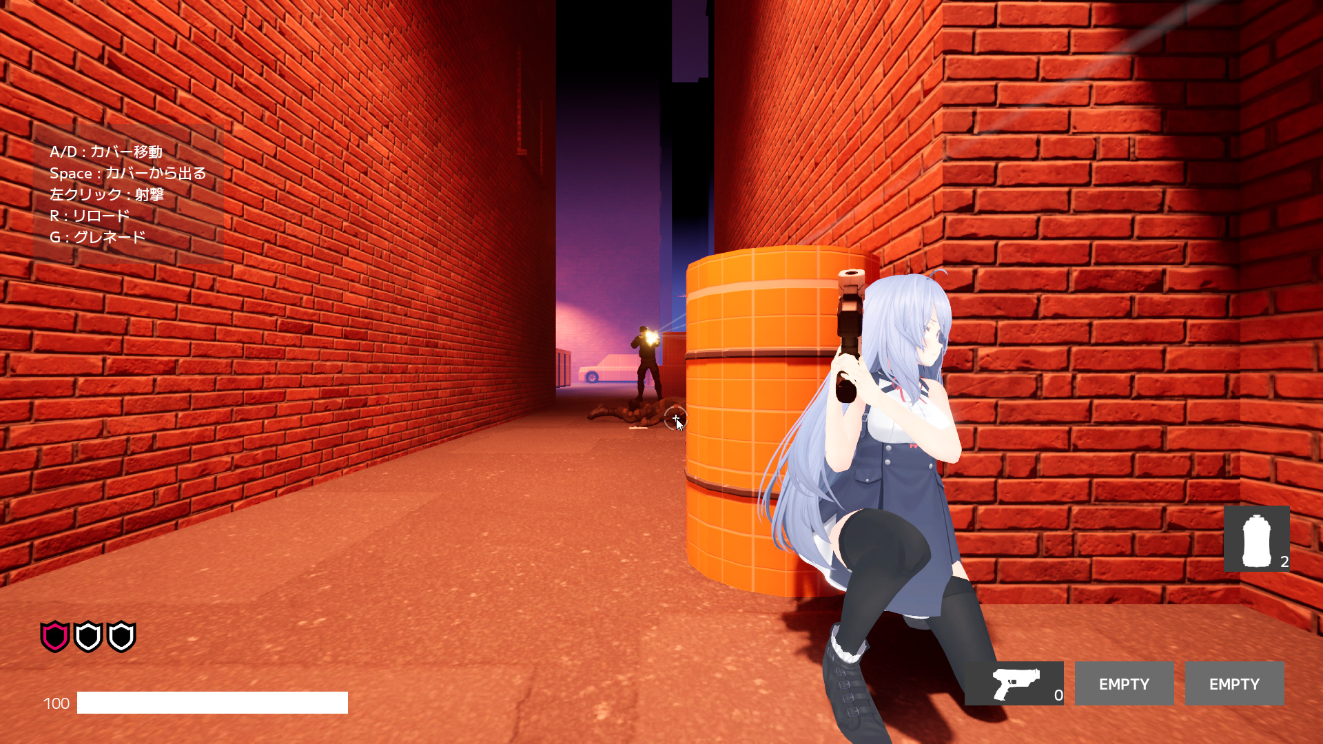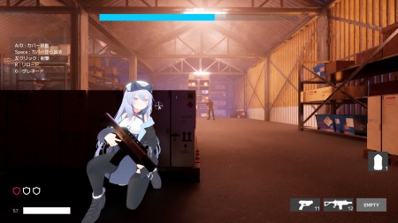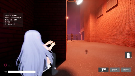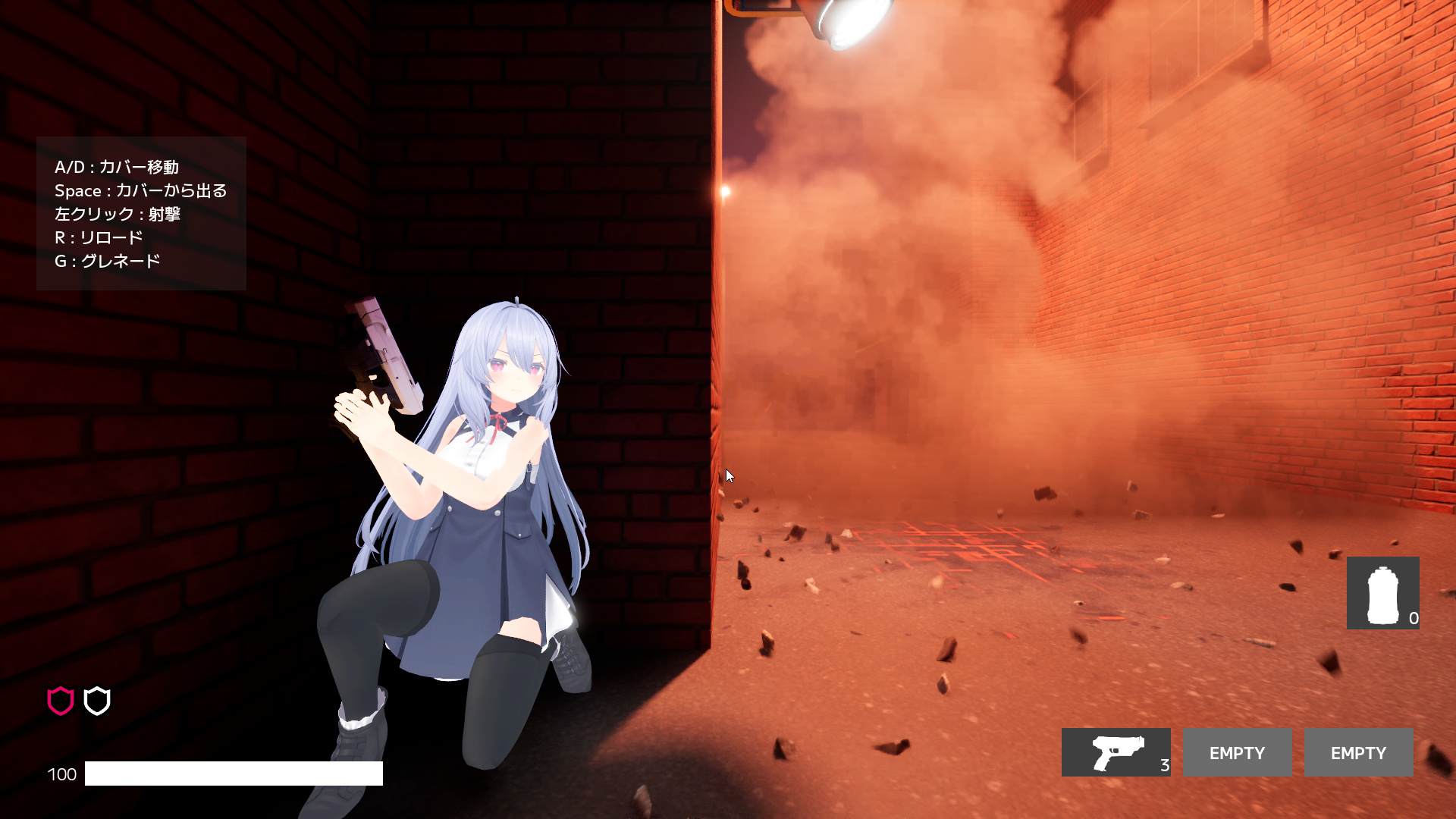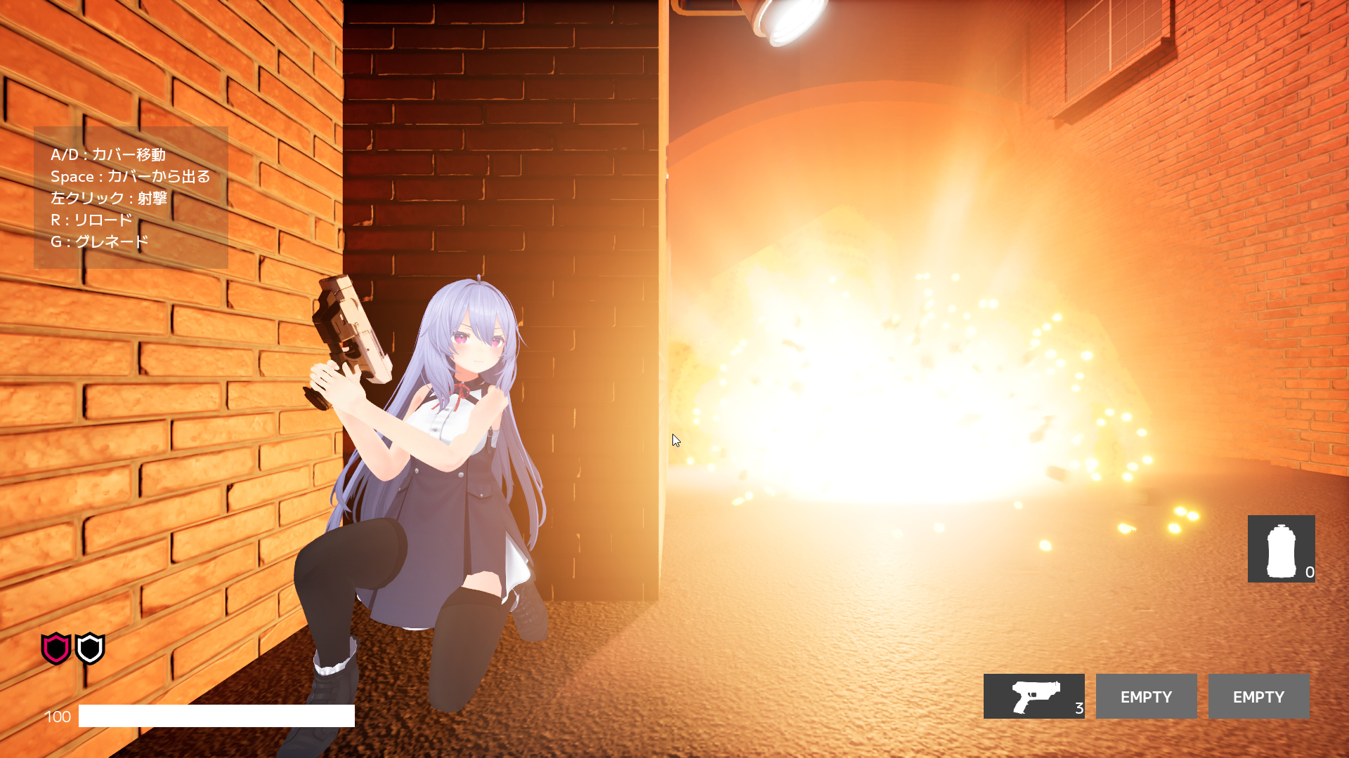 という事で、キーボードにより壁等への隠れ~現れ、弾のリロード、グレネード投擲を、そしてマウスで銃の照準を合わせて撃つのだ……というアクションとなりますが、少し残念なのはまぁケツブル的な要素は一切無し。むしろ主人公はロリぽい女の子だしな……。