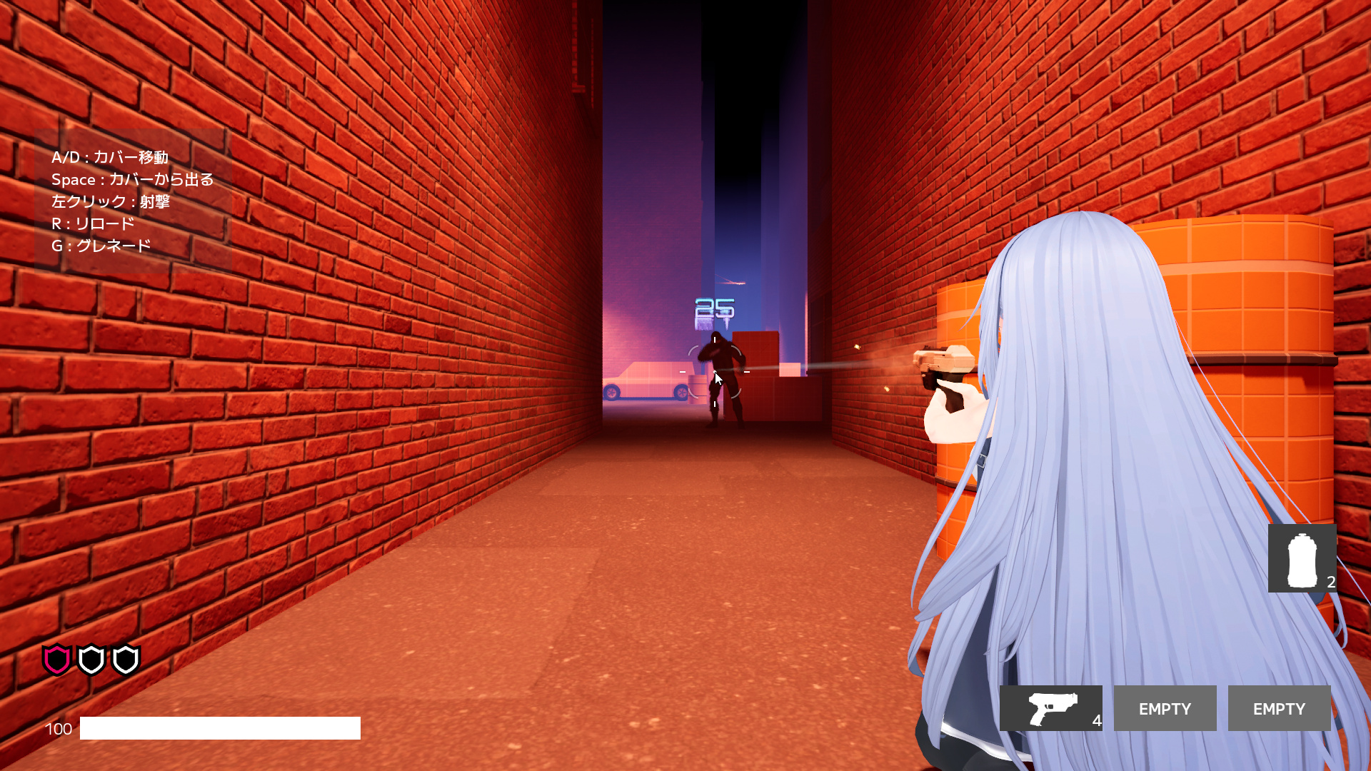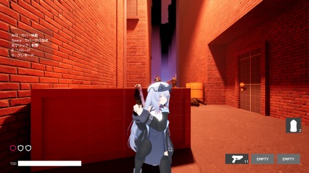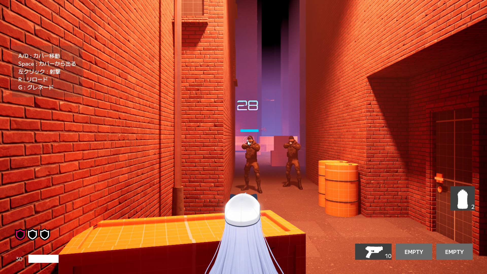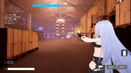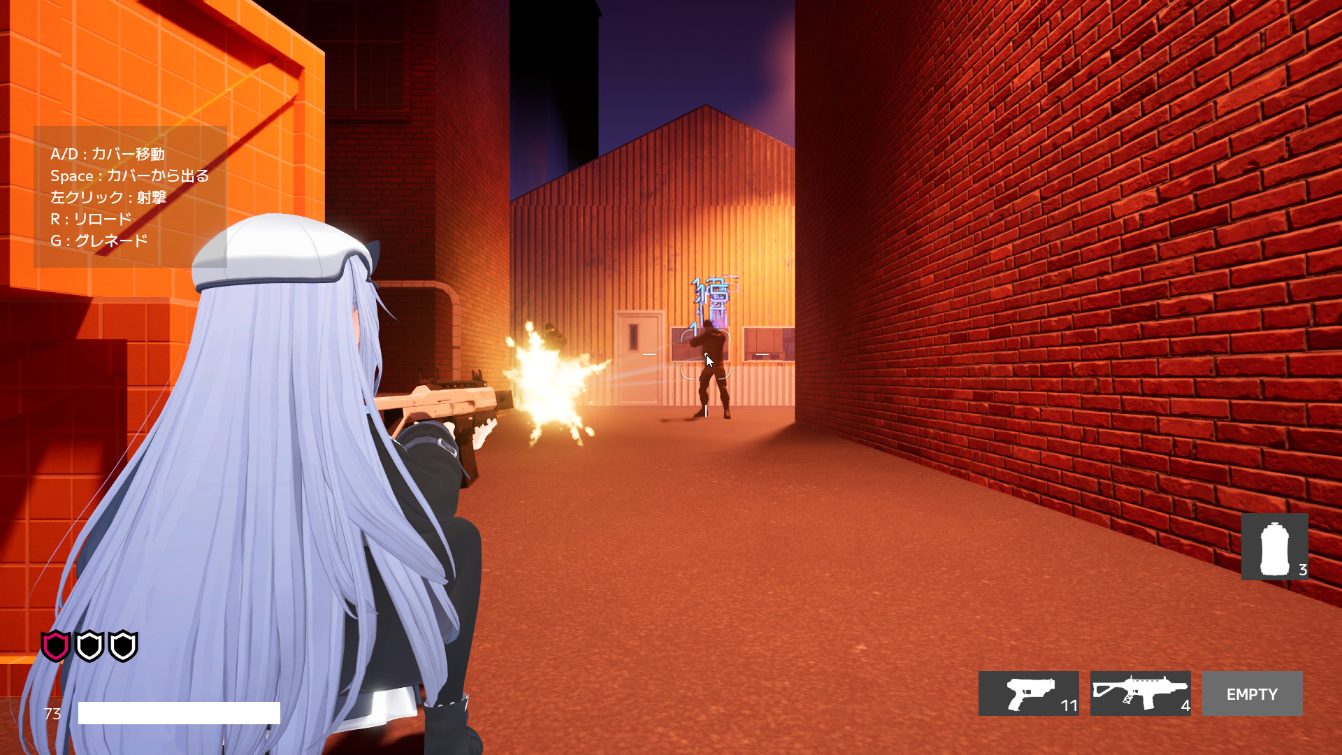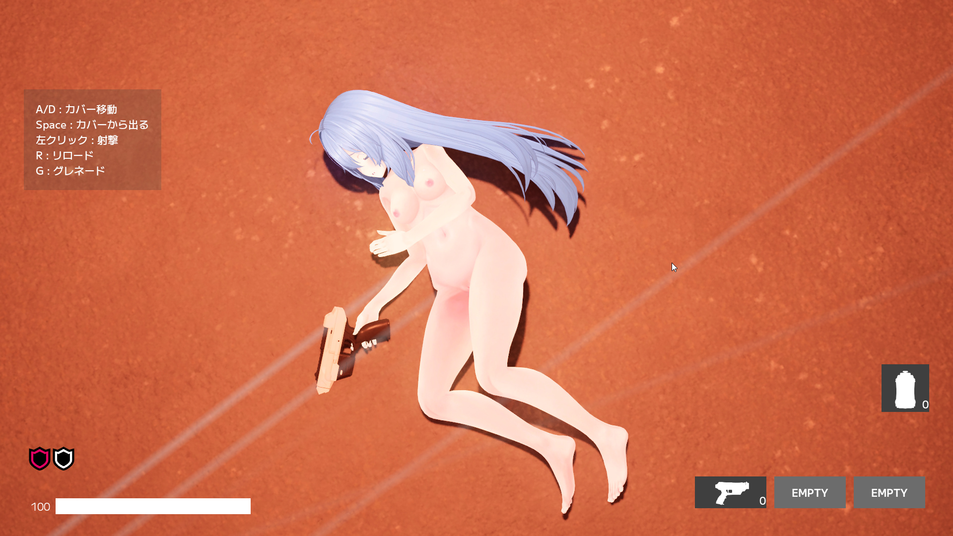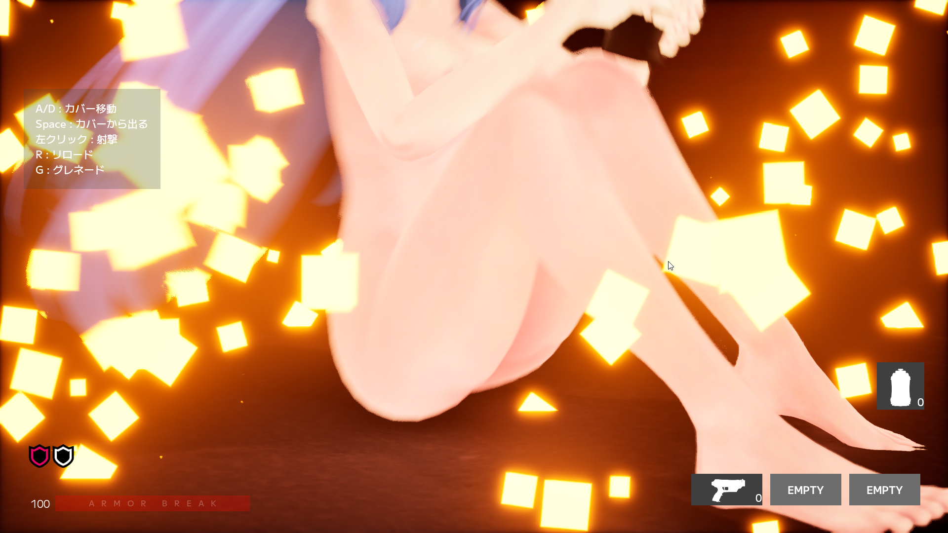 という事で、キーボードにより壁等への隠れ~現れ、弾のリロード、グレネード投擲を、そしてマウスで銃の照準を合わせて撃つのだ……というアクションとなりますが、少し残念なのはまぁケツブル的な要素は一切無し。むしろ主人公はロリぽい女の子だしな……。