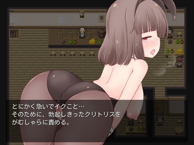 呪いによりバニー服が脱げなくなった女の子が、酒場でお金稼ぎ&呪いを解く為のダンジョン攻略。しかしものの数十歩歩けば発情してしまう体質、戦闘中でもすぐオナニー、バイト中でも地下室に駆け込んでは股間を弄っちゃう……そんな子を酒場の酔客が放っておく訳はなく……と。