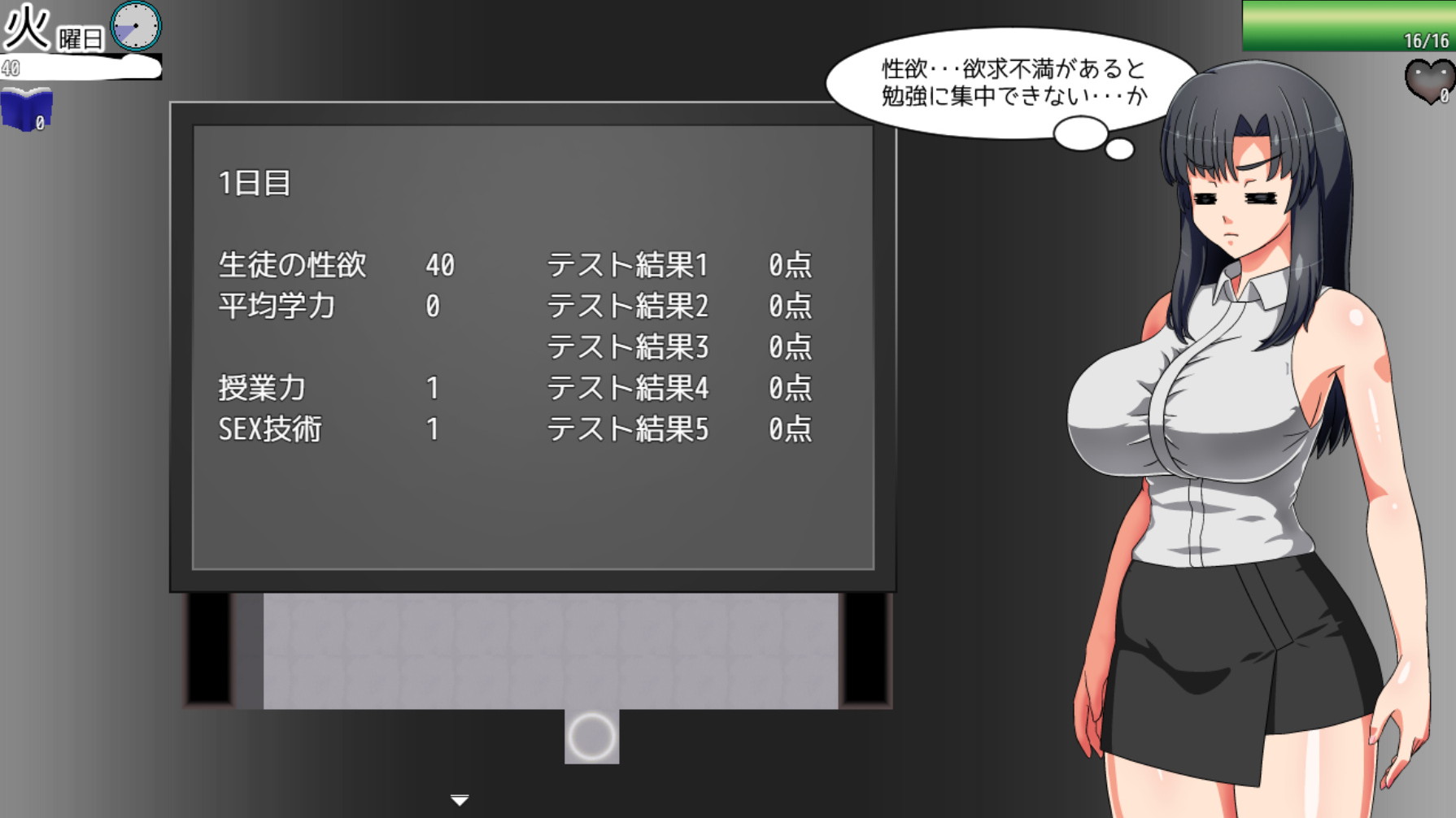 どうも生徒たちには「性欲」「学力」値が存在、先生の方には「SEX力」「授業力」があって、30日間で学力100を目指すゲームだ……とやりたい方向は分かるんですが、その解決として、サクッとSEXするのはどう……かな(前任の先生もそれでダメだったのでは?)